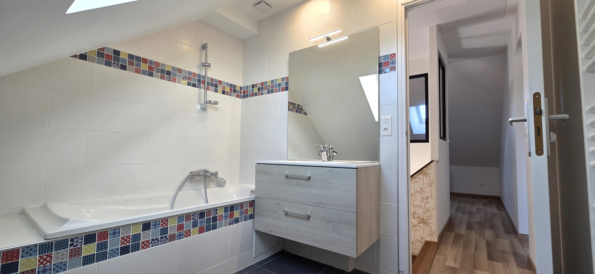 A l'étage, palier desservant 3 chambres, salle de bains et WC.
