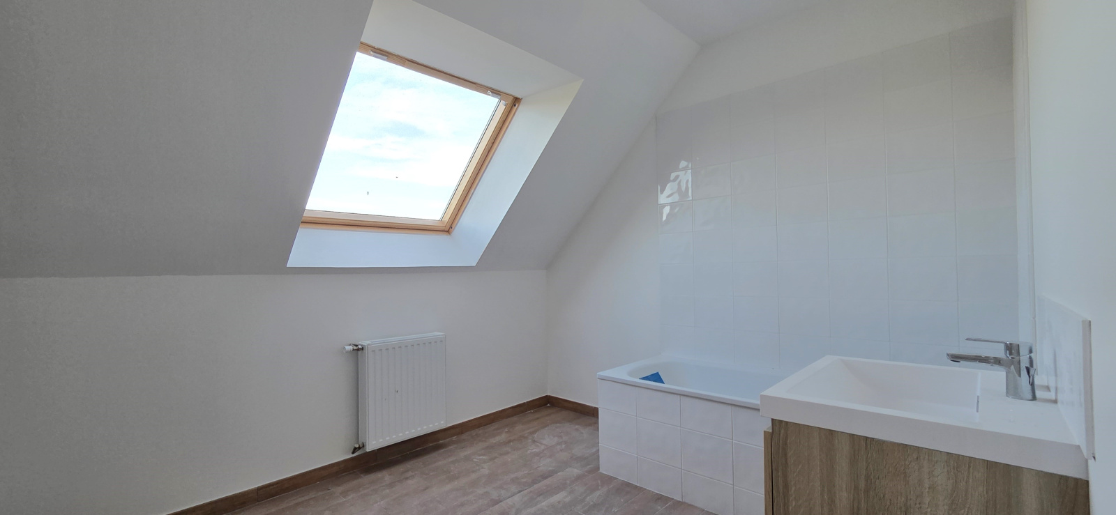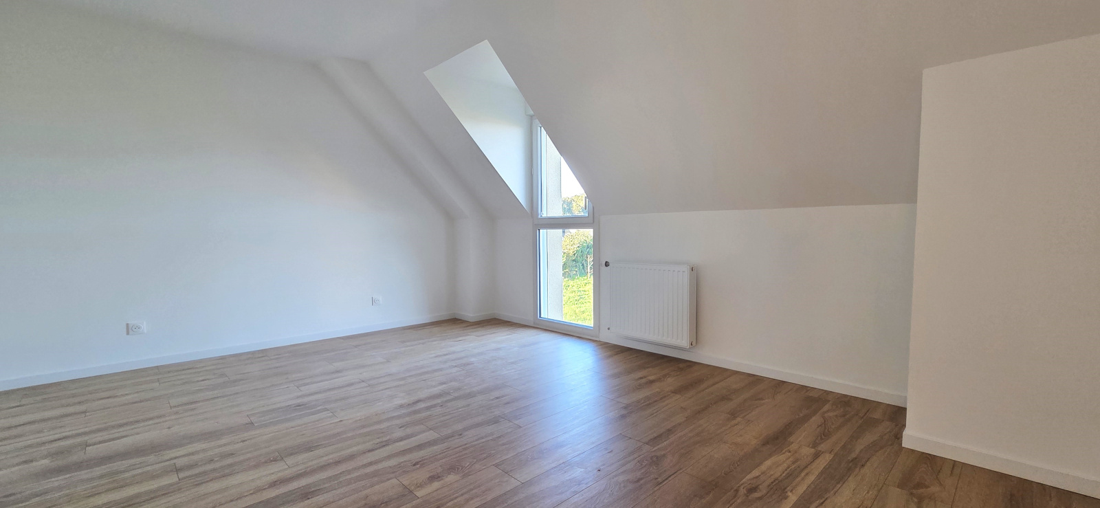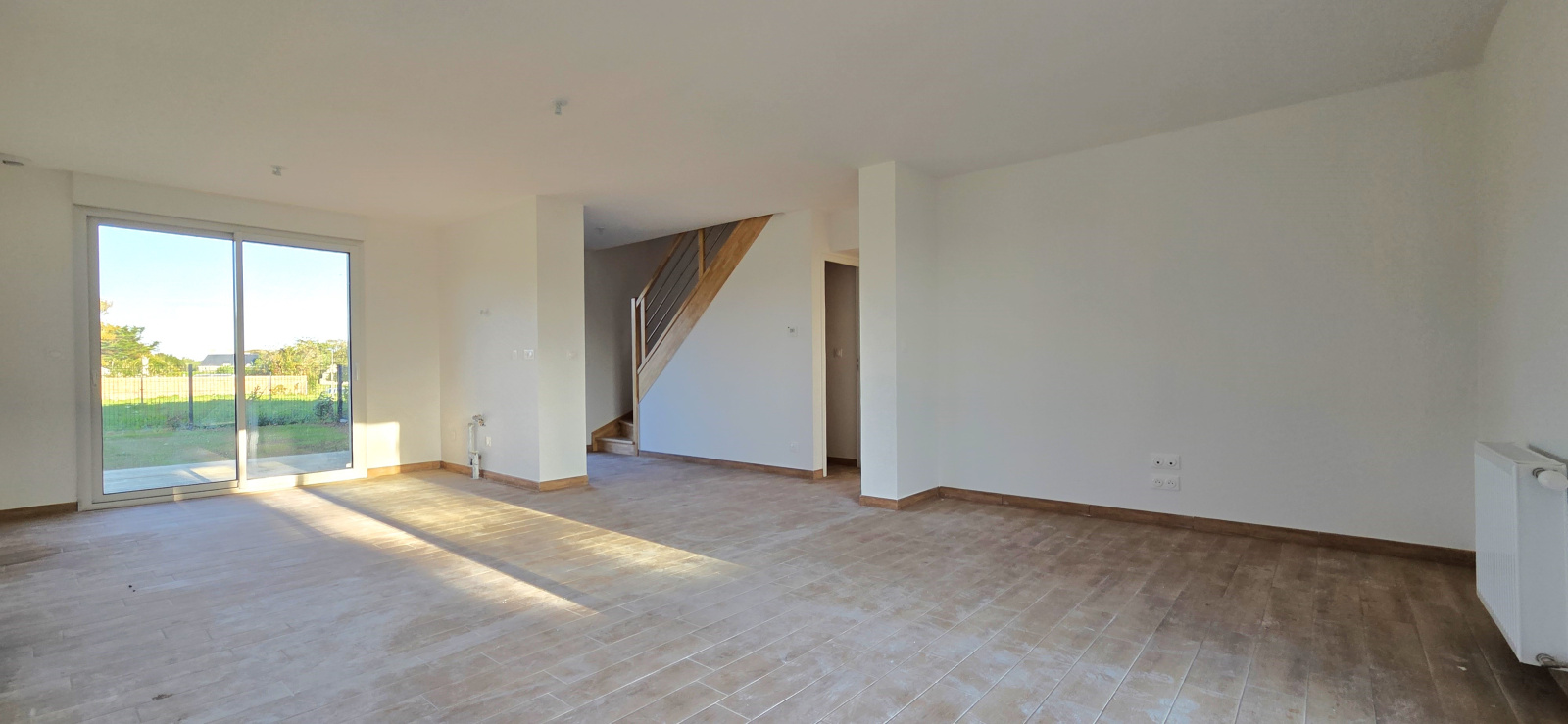 Au rez-de-chaussée, vous trouverez une entrée avec espace prévu pour des placards, une grande pièce de vie lumineuse avec coin cuisine (la cuisine sera montée, plans disponibles sur demande), une chambre, une salle d’eau, des toilettes séparées ainsi qu'un local pour la pompe à chaleur.