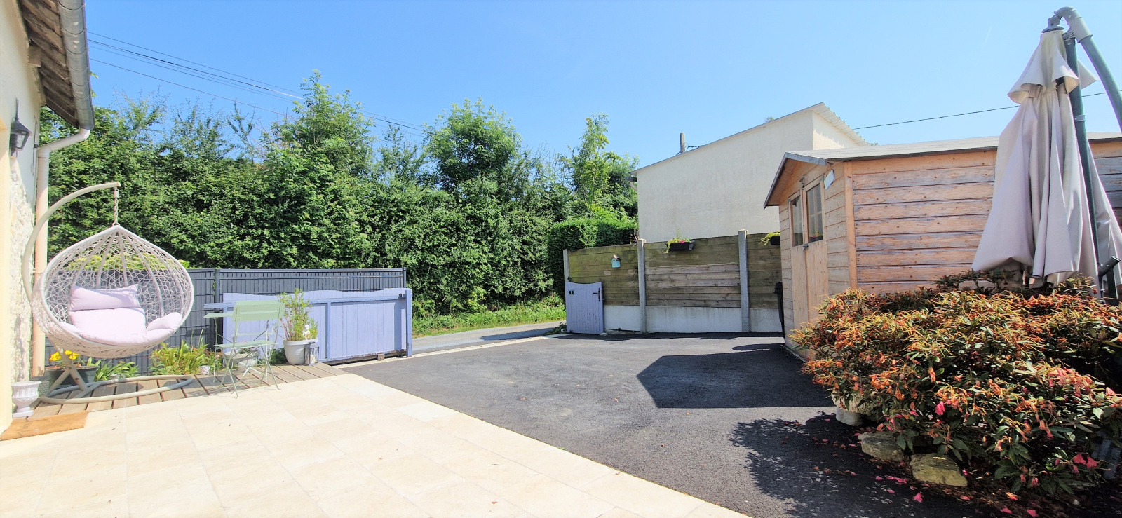 Agréable cour exposée plein Sud et entièrement cloturée permettant le stationnement et cabanon de jardin.