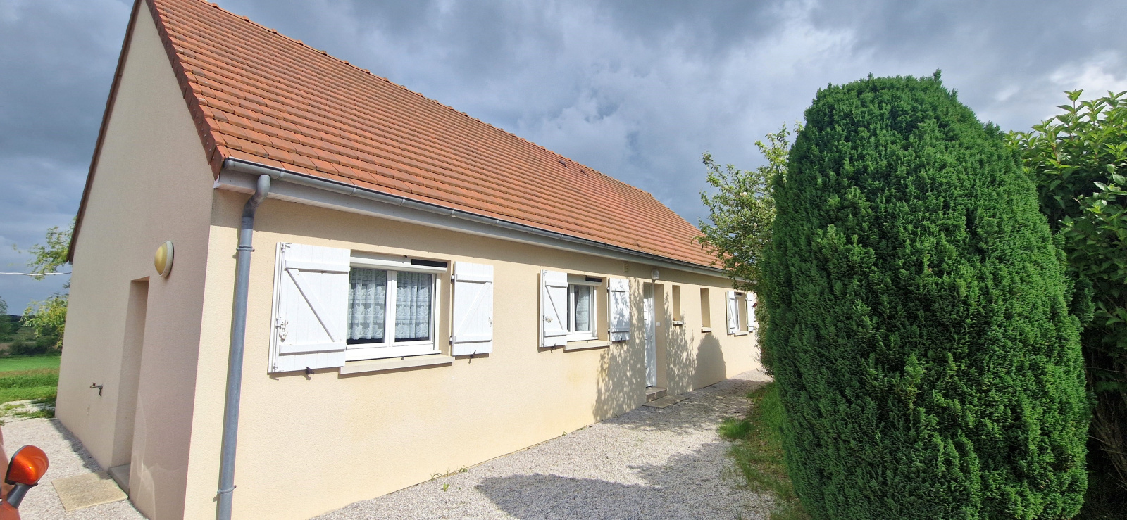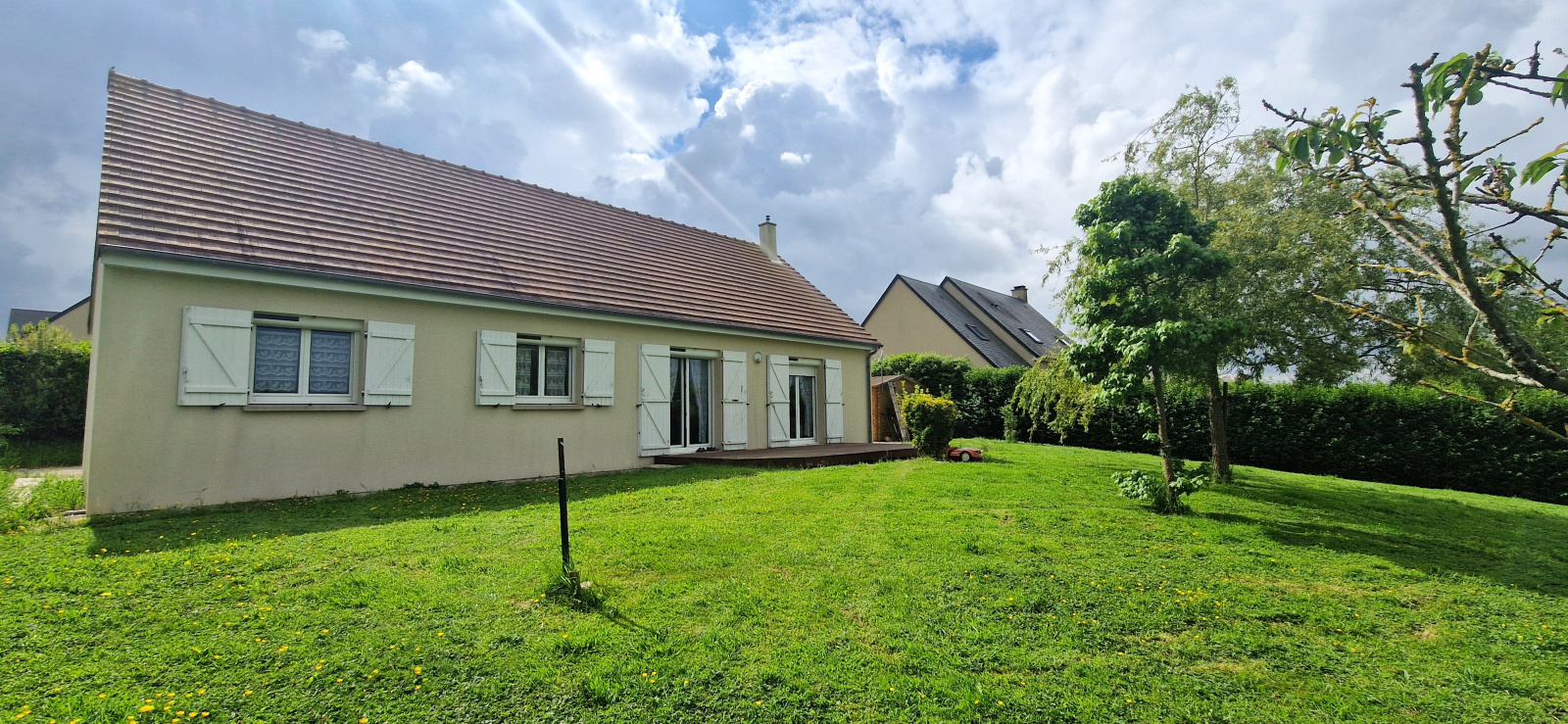 Il est implanté sur un terrain entièrement clos de 794 m² et se compose d'un vaste séjour de 42 m² avec poêle à granulés, cuisine ouverte aménagée et équipée, 3 chambres, salle d'eau, cellier et WC.