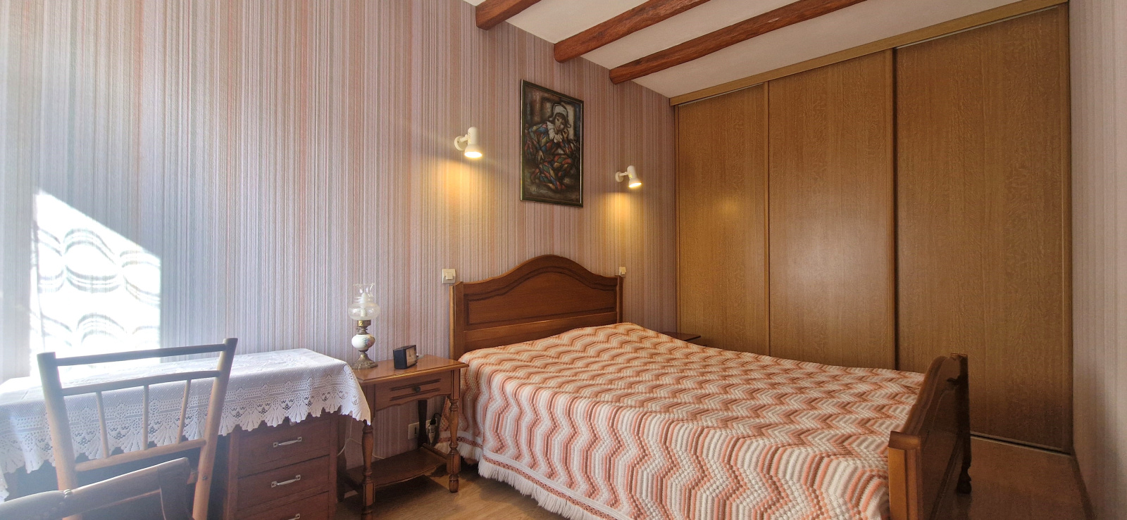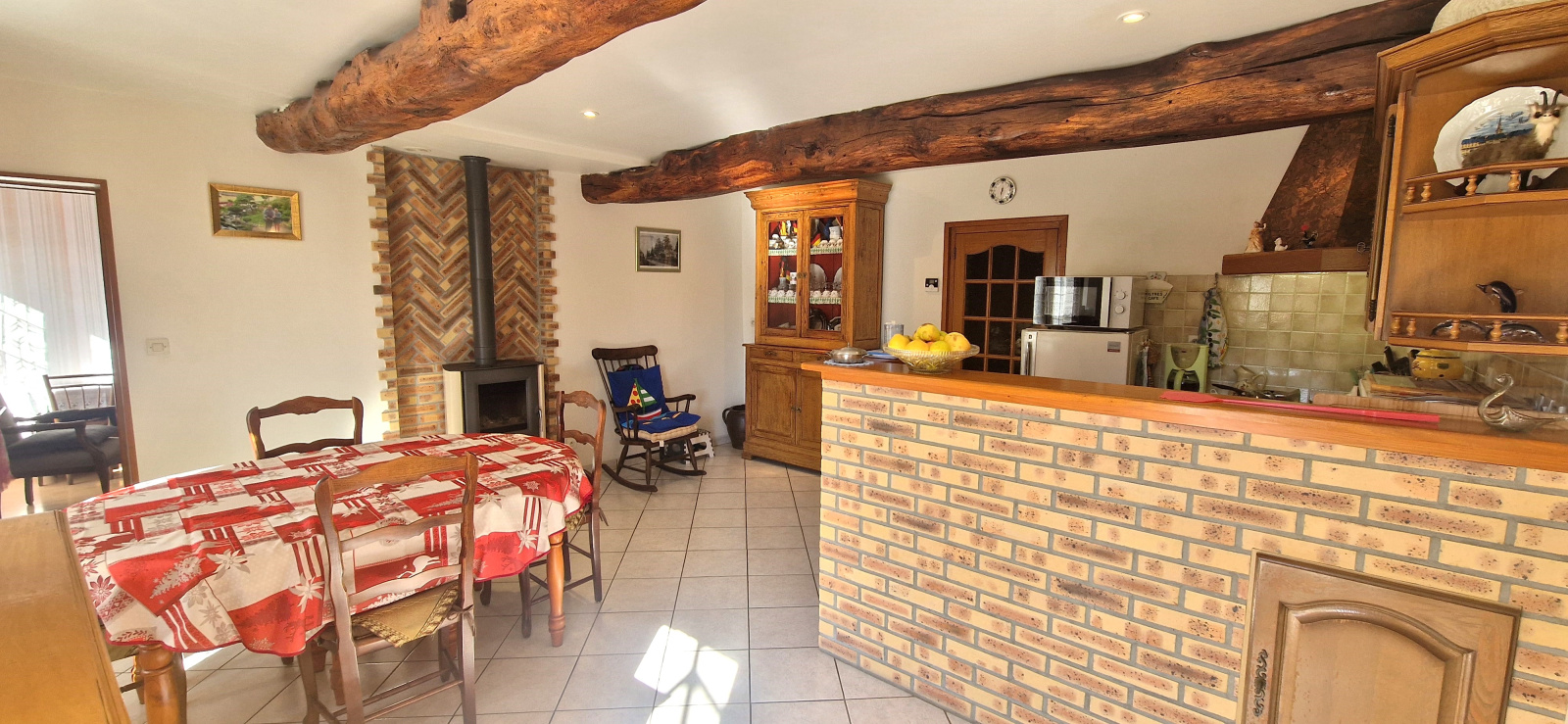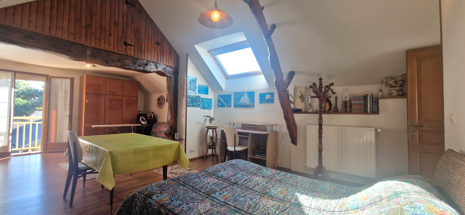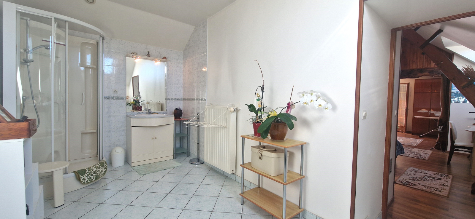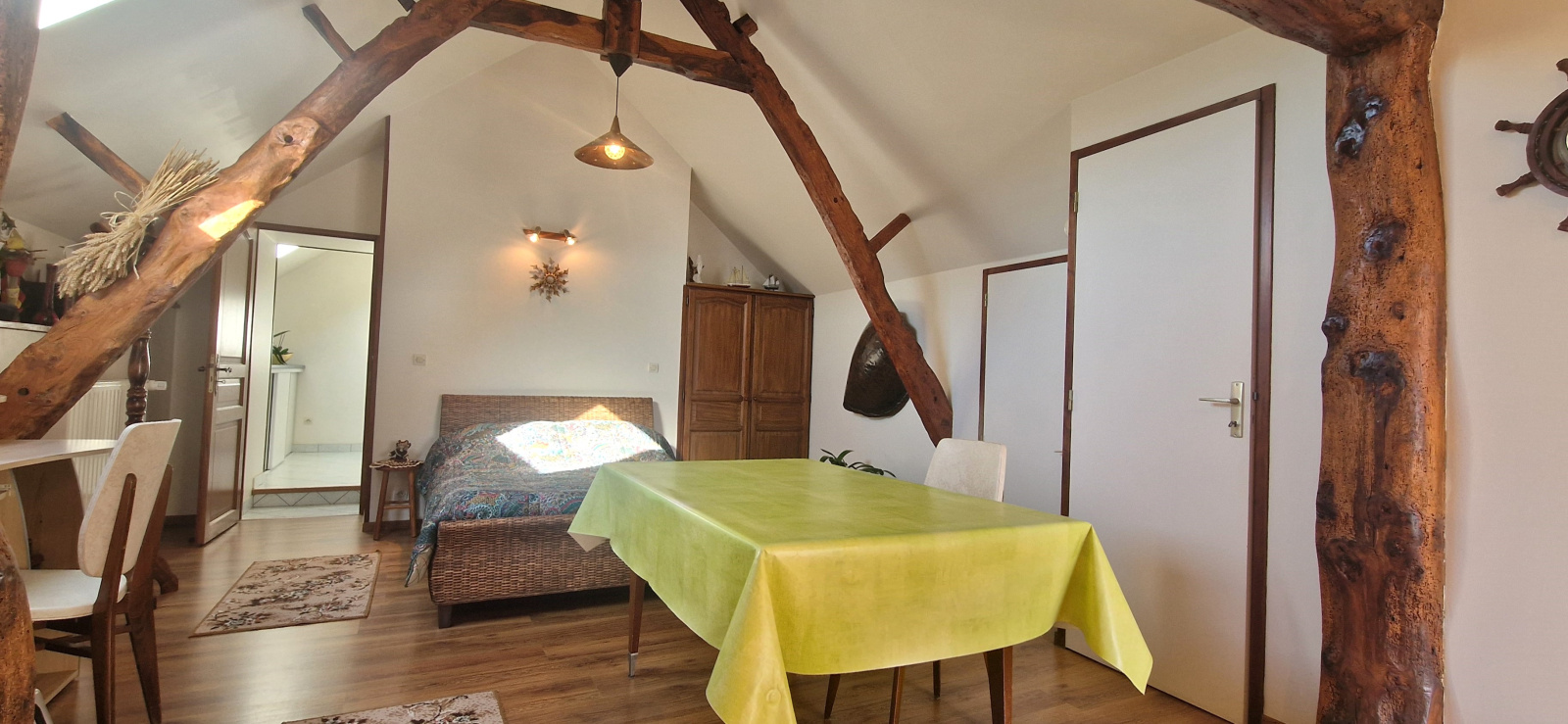 A l'étage: une grande chambre lumineuse, salle d'eau, WC et grenier.