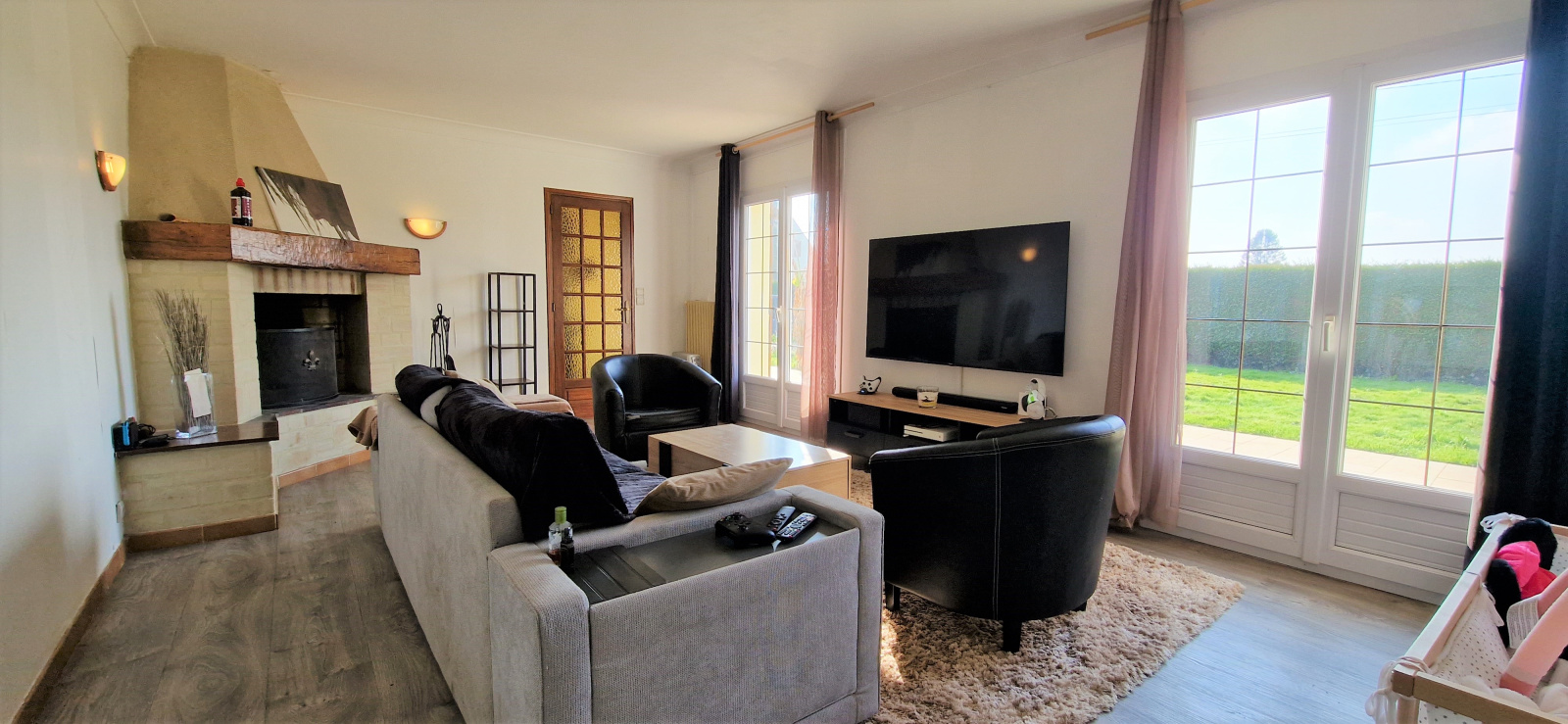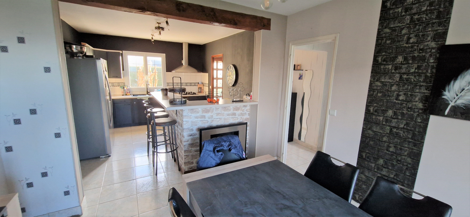 rez-de-chaussée d'une entrée offrant l'accès à une salon avec cheminée, cuisine aménagée et équipée ouverte sur la salle à manger, chambre, salle de bains et WC.
