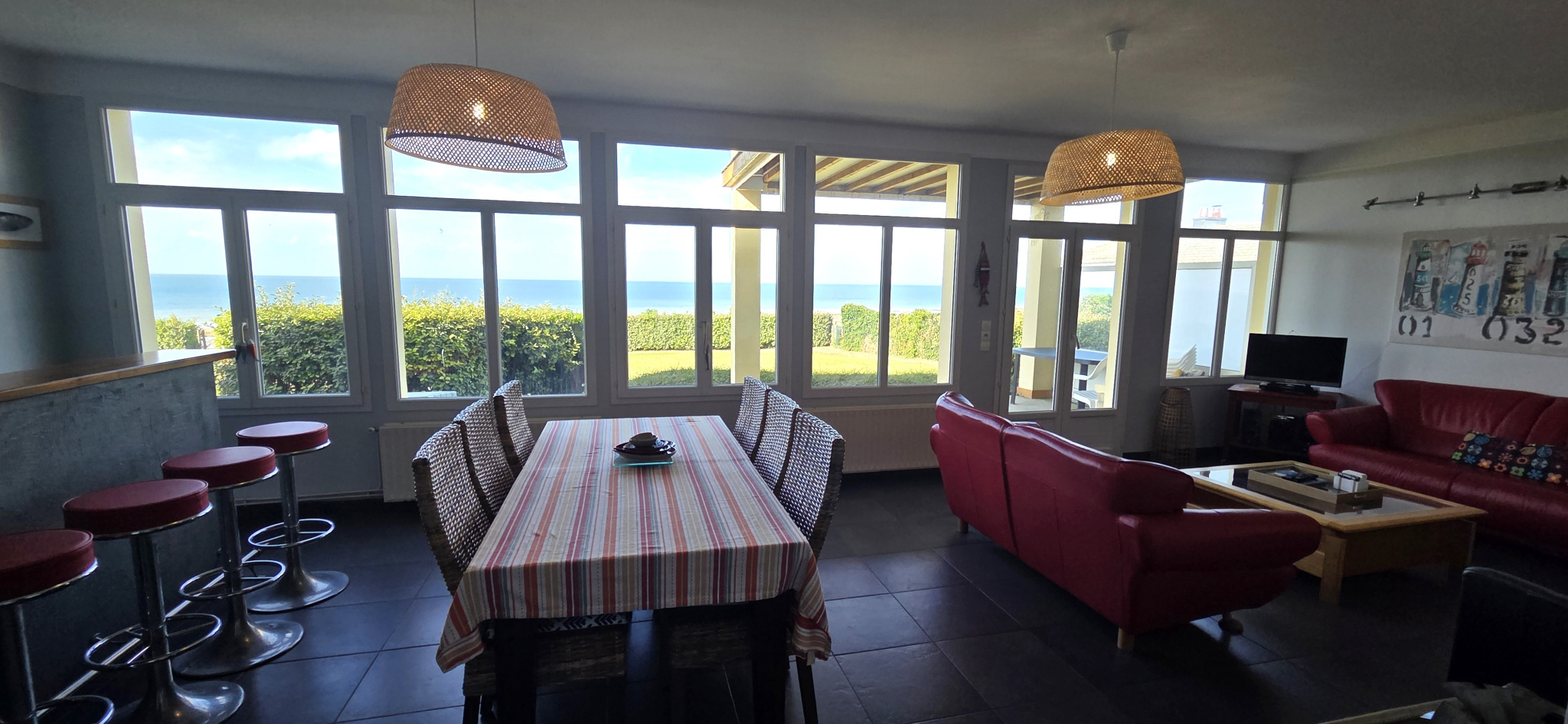 Situé au rez-de-chaussée de la résidence, il se compose d'une entrée desservant un séjour-salle à manger avec cheminée et accès terrasse surplombant la mer, cuisine aménagée et équipée, 3 chambres, salle d'eau et WC indépendant.