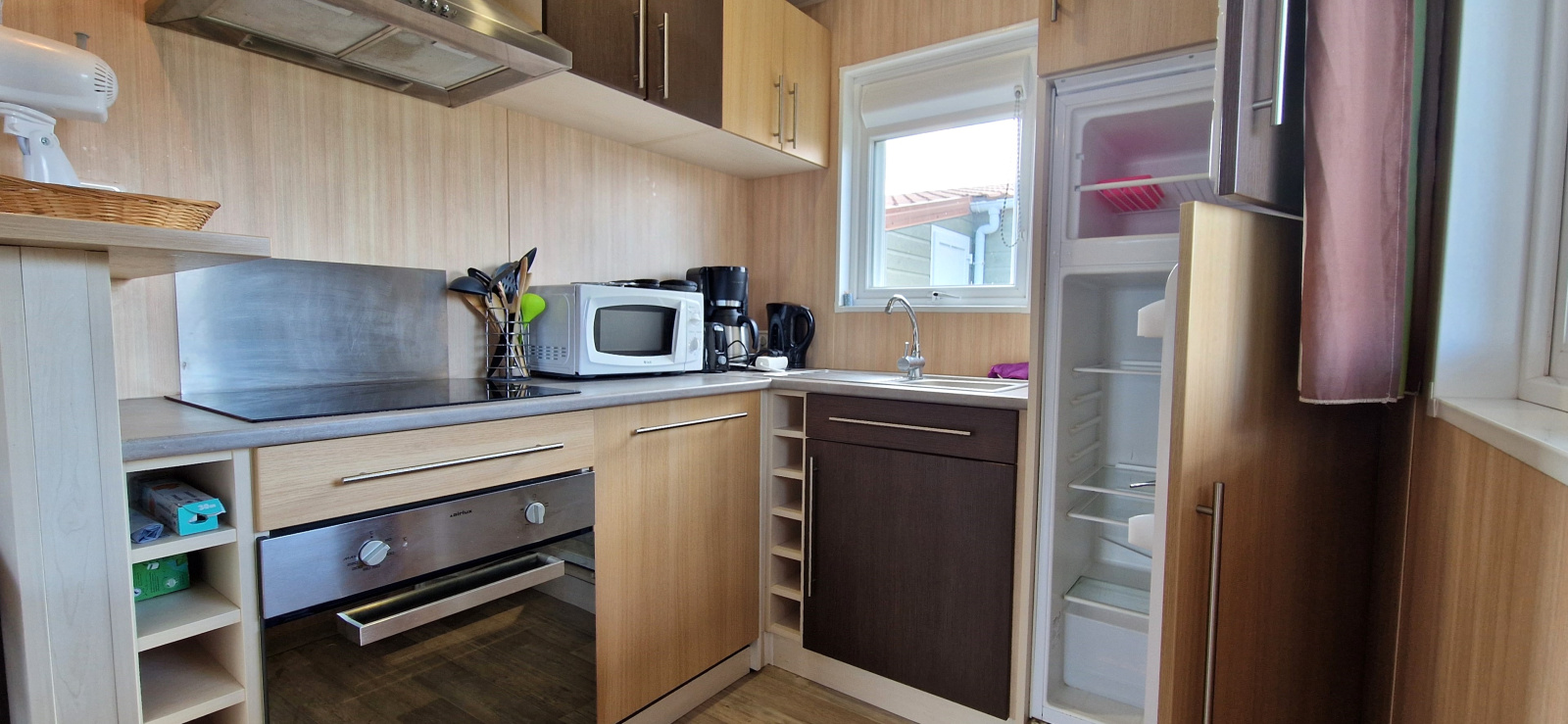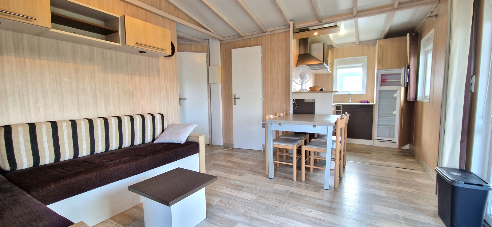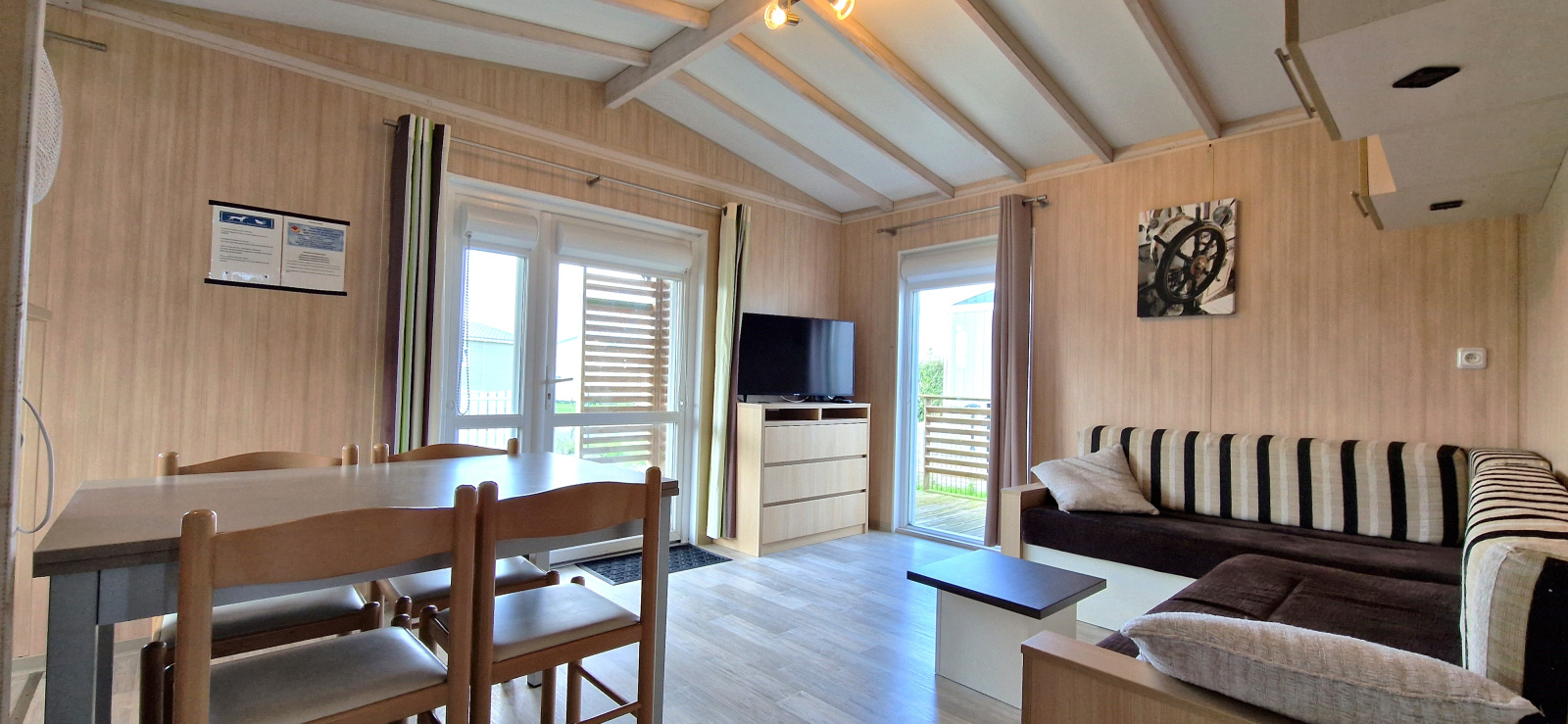 Vendu meublé. Le tout se situe dans un Parc Résidentiel de Loisirs sécurisé avec piscine couverte et chauffée, pataugeoire, aire de jeux, aire de rinçage bateau, boulodrome, etc ... (vous devenez bien propriétaire du terrain).