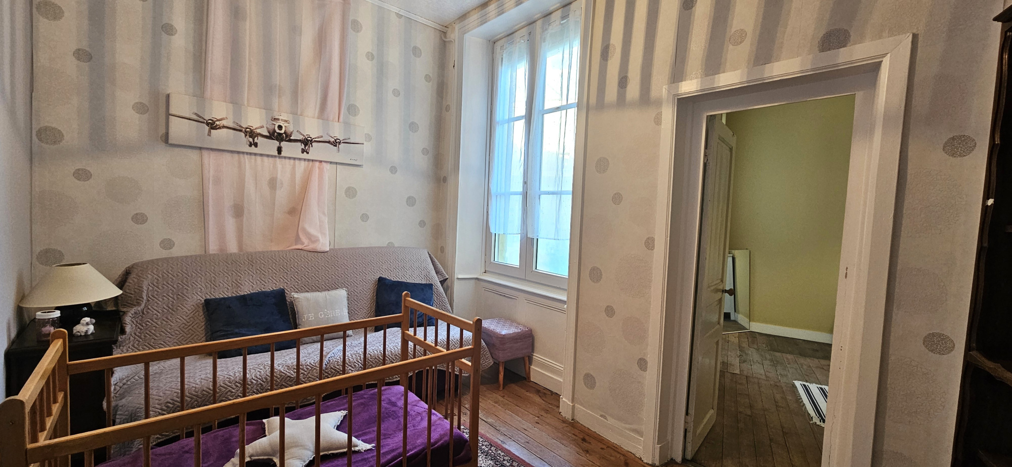 À l’étage, un palier dessert trois chambres, dont deux en enfilade avec un beau parquet bois, ainsi qu’une salle de bains avec WC.
