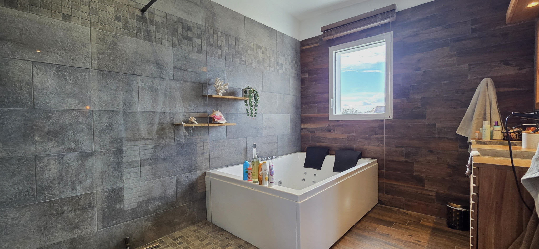 À l’extérieur, vous profiterez d’une superbe terrasse en bois, exposée ouest et récemment réalisée, ainsi que d’un jardin agréable.