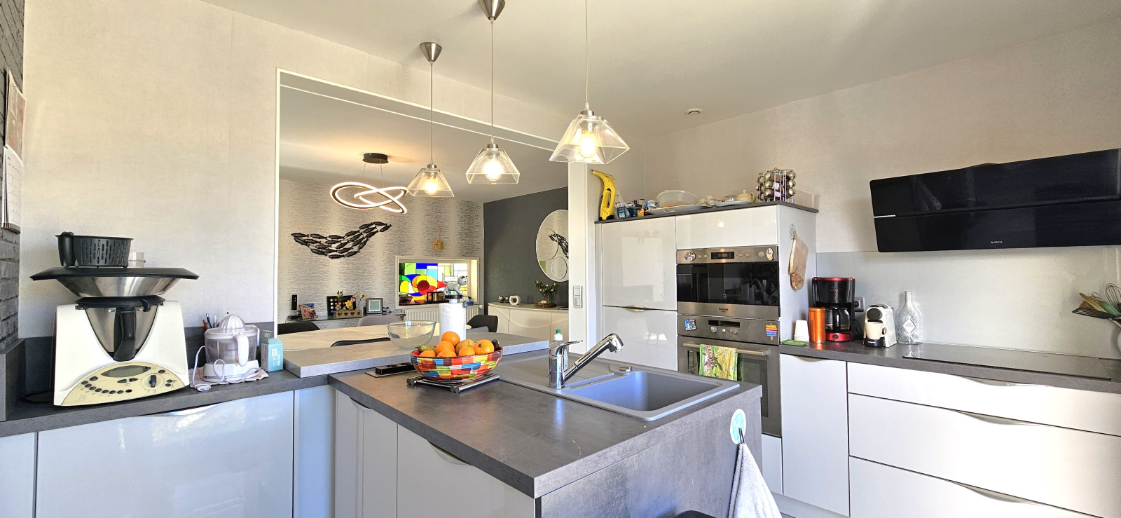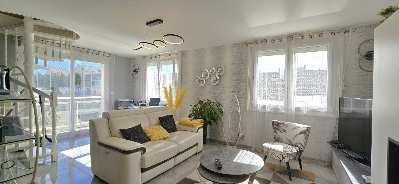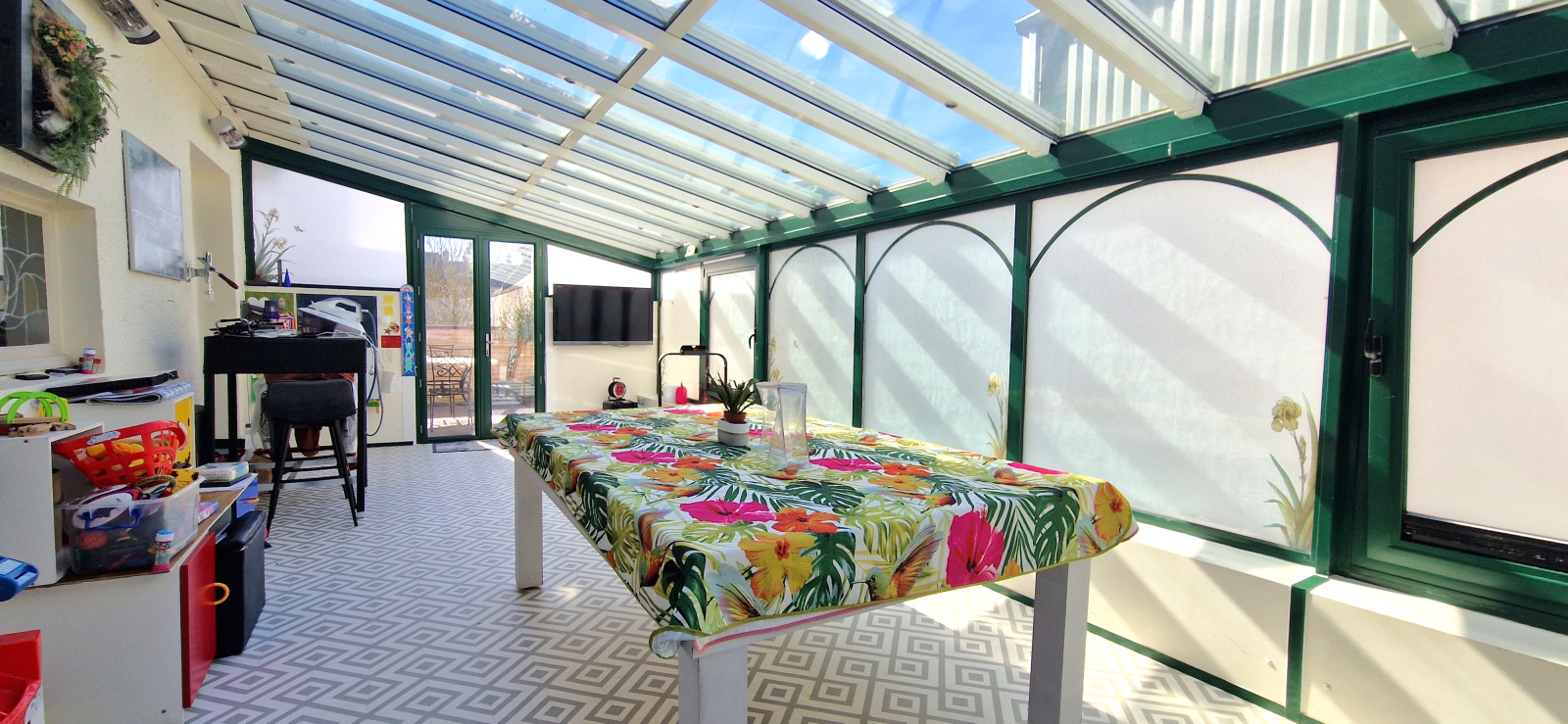 Le rez-de-chaussée se compose d’une cuisine aménagée et équipée, d'un spacieux séjour, d’un salon lumineux, d’une véranda de 35m² donnant sur la terrasse plein SUD. Une chambre, une salle d'eau et un WC complètent ce niveau.