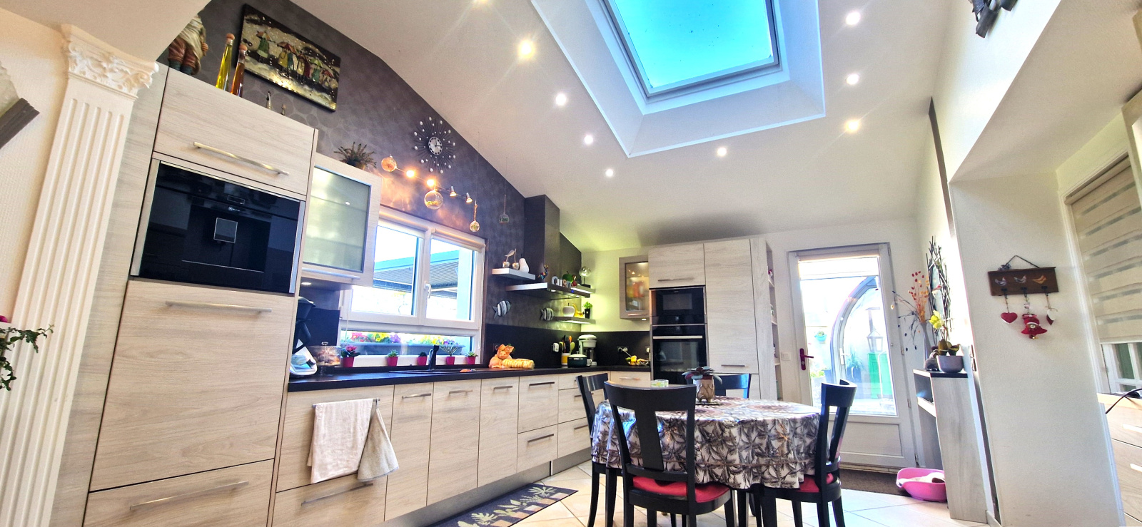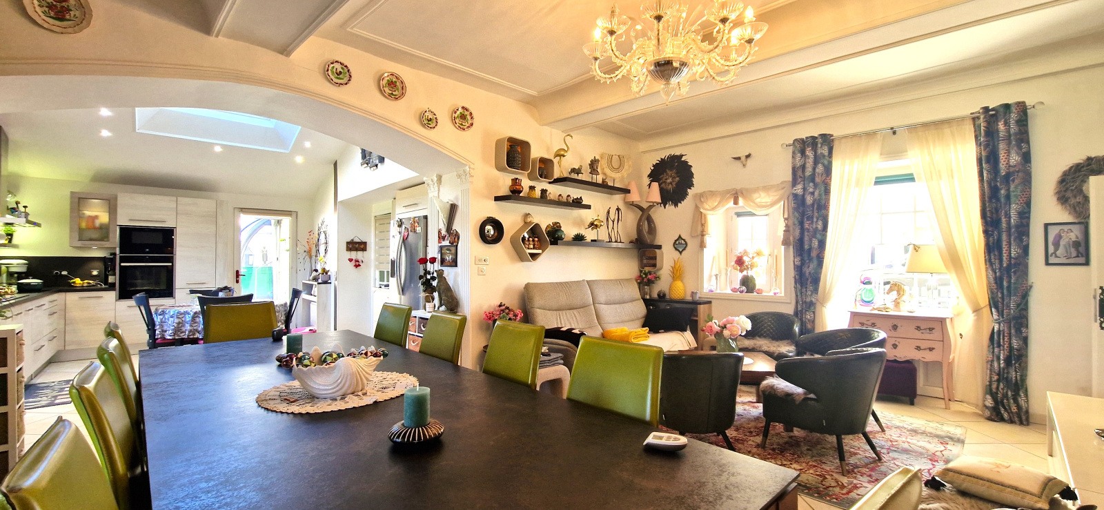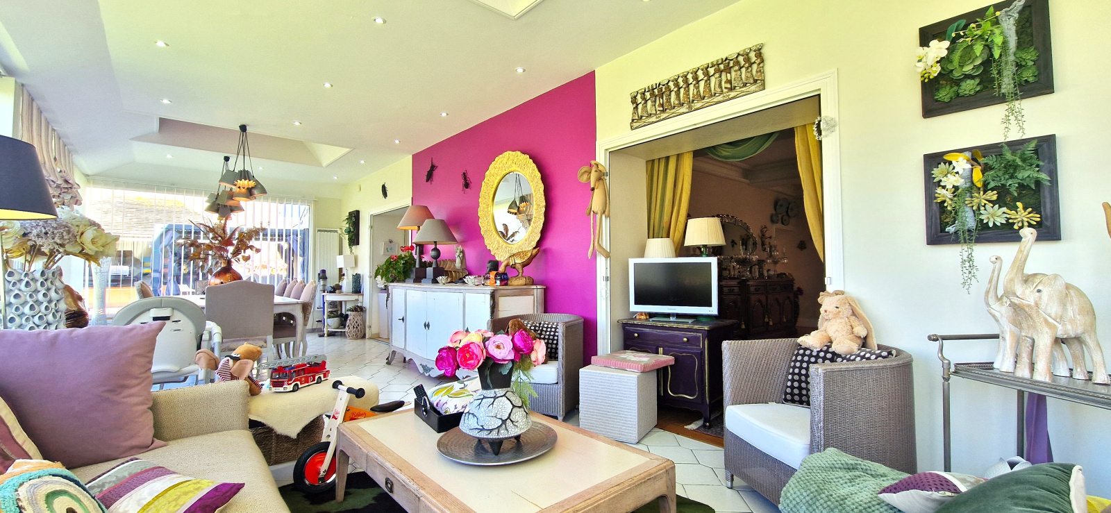 La maison principale est composée d'une entrée, salon, 2 salles à manger avec cuisine ouverte aménagée et équipée, véranda sur le jardin, chambre et salle de bains en rez-de-chausée.