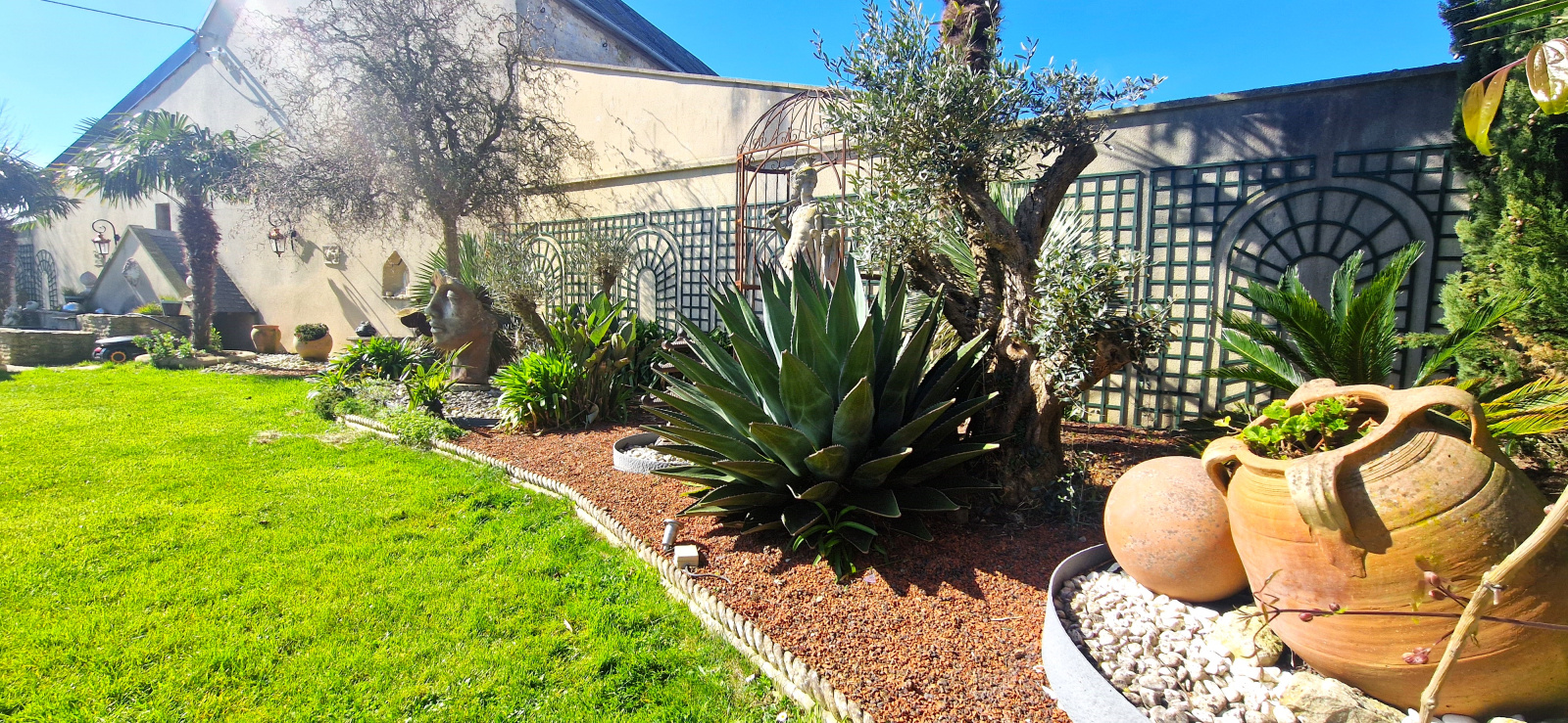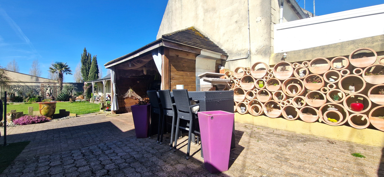 Superbe jardin clos, arboré et à l'abri des regards à l'arrière avec terrasse, spa et nombreuses remises.