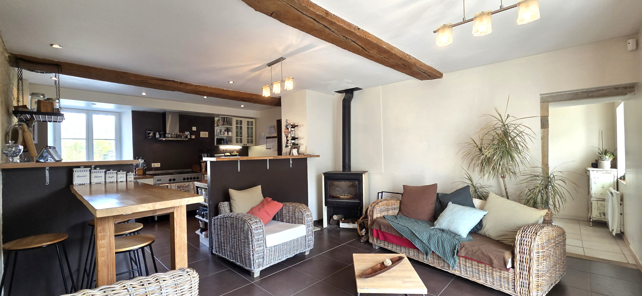 La partie habitable se compose d'une entrée offrant l'accès à un salon, séjour avec cuisine ouverte, salle à manger, buanderie, salle d'eau et WC.