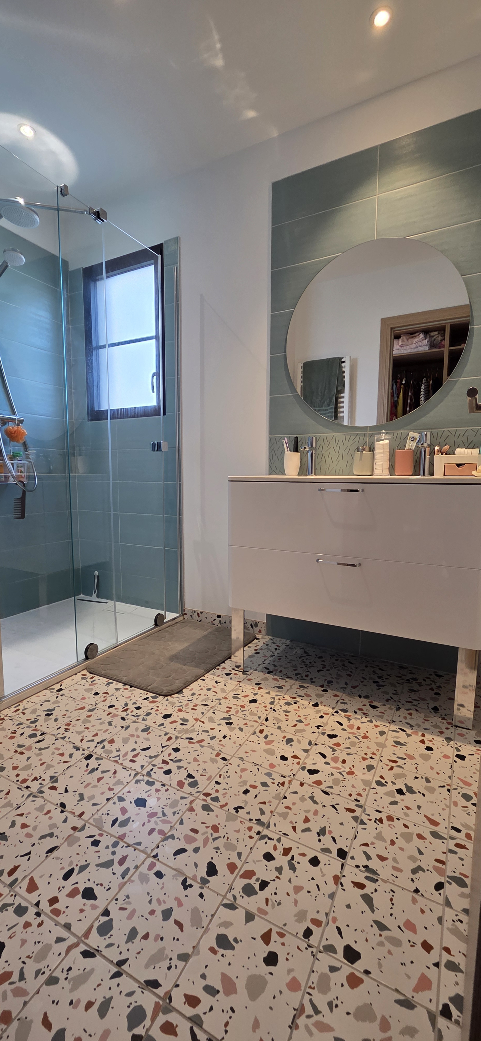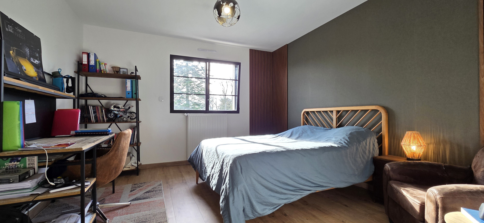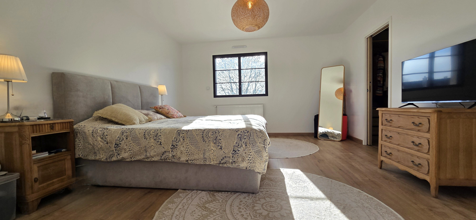 À l’étage, une mezzanine dessert trois chambres confortables. Une première avec dressing et salle de bains privative (douche et baignoire). Deux autres avec chacune un accès au dressing et salle d'eau. WC indépendant.