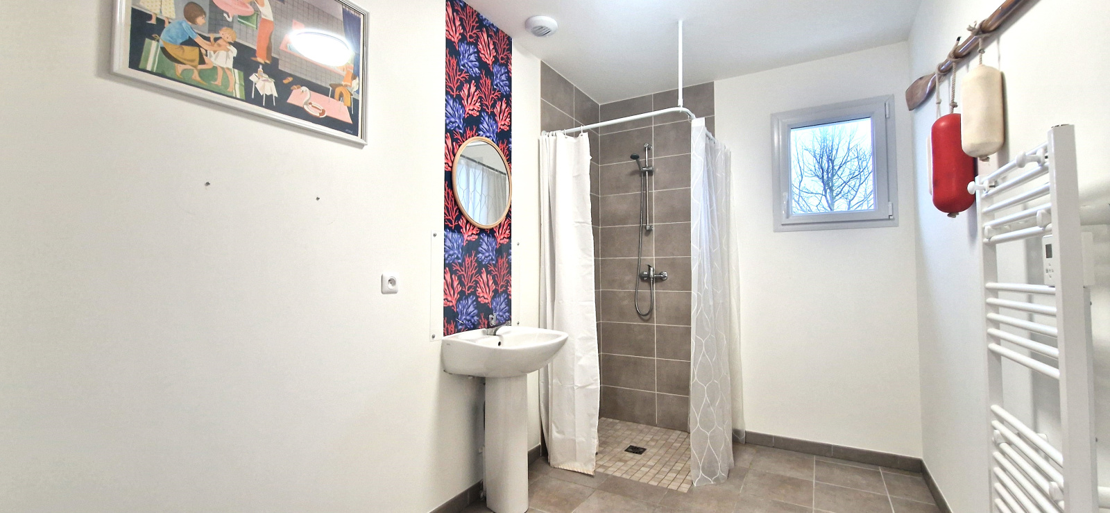 Un couloir dessert deux chambres d'environ 10m² chacune, salle d'eau avec WC.