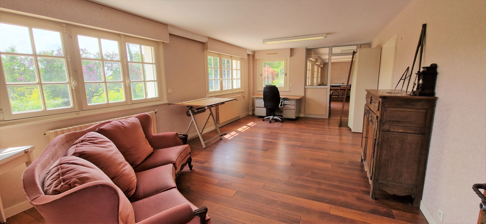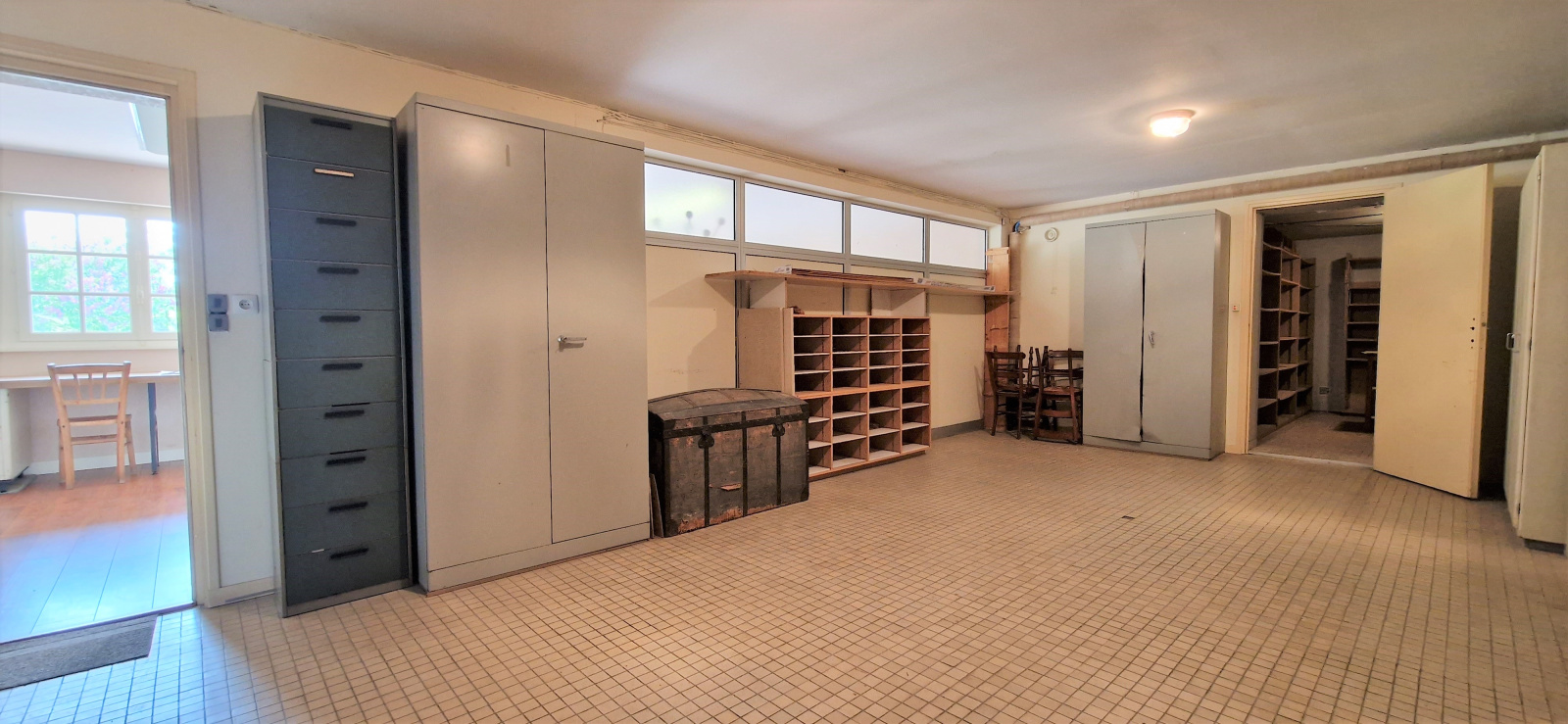 Sous-sol complet compartimenté en bureaux, garages, cave, chaufferie, buanderie.