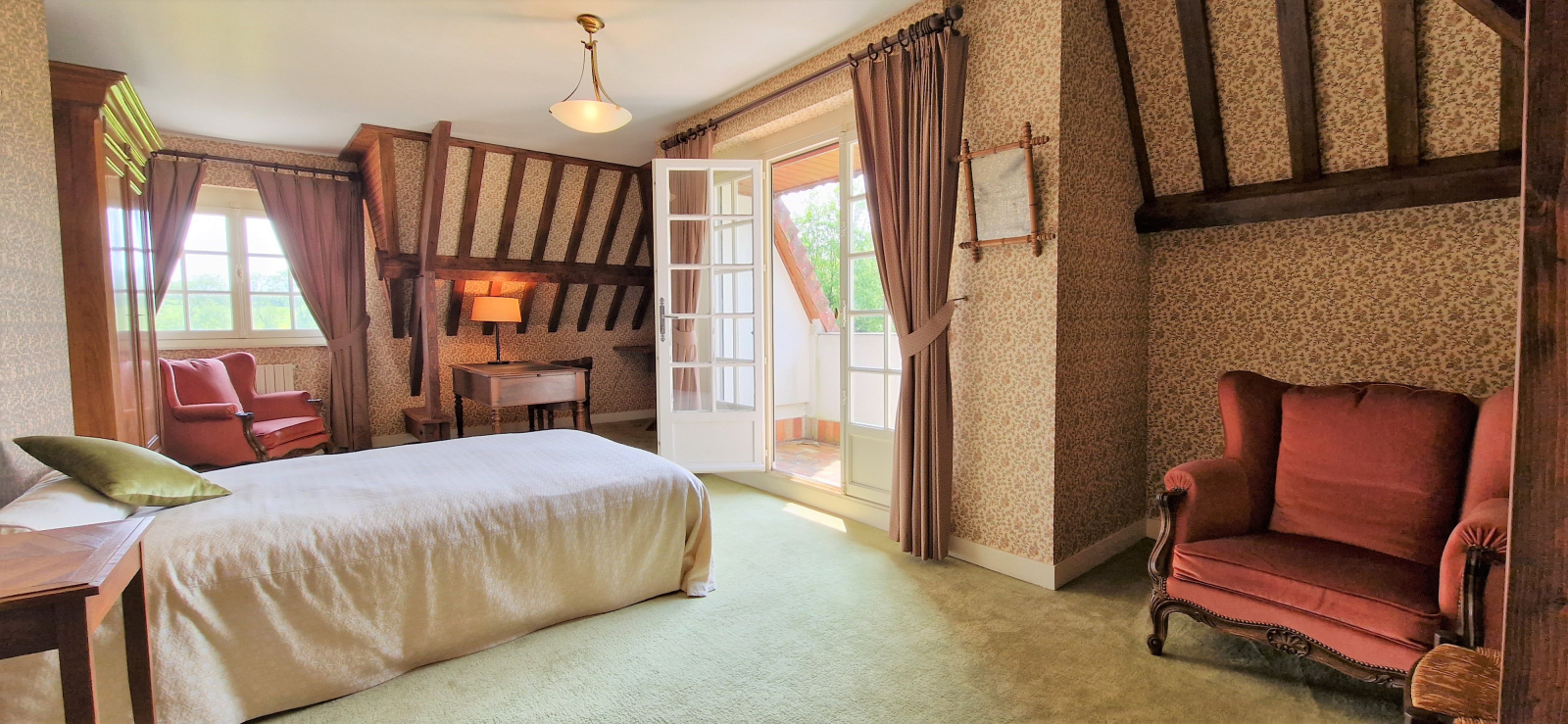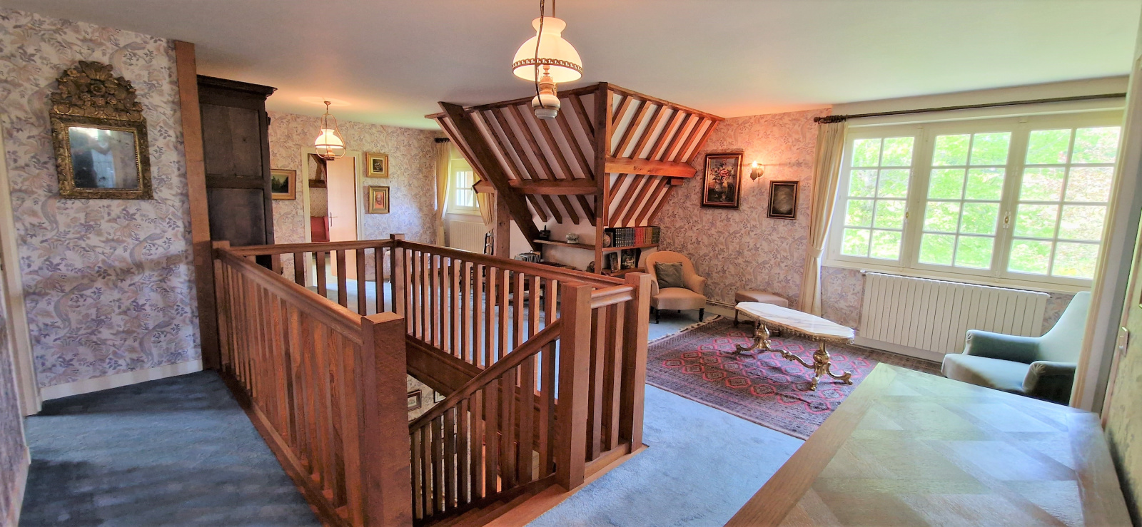 A l'étage, une spacieuse mezzanine dessert 3 chambres, salle de bains et WC.